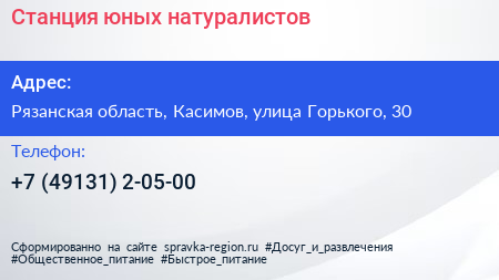 Станция юных натуралистов по адресу Рязанская область, Касимов, улица Горького, 30 в дальнейшем Организация, размещена в следующих категориях:
