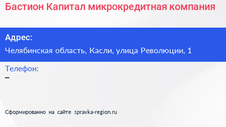 Бастион Капитал, микрокредитная компания по адресу Челябинская область, Касли, улица Революции, 1 в дальнейшем Организация, размещена в следующих категориях: