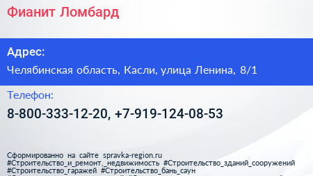 Фианит-Ломбард по адресу Челябинская область, Касли, улица Ленина, 8/1 в дальнейшем Организация, размещена в следующих категориях: