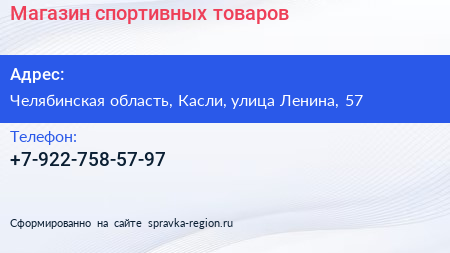 Магазин спортивных товаров по адресу Челябинская область, Касли, улица Ленина, 57 в дальнейшем Организация, размещена в следующих категориях: