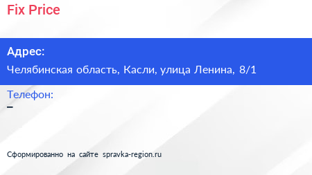 Fix Price по адресу Челябинская область, Касли, улица Ленина, 8/1 в дальнейшем Организация, размещена в следующих категориях: