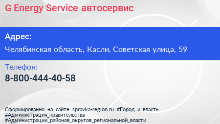 G-Energy Service, автосервис по адресу Челябинская область, Касли, Советская улица, 59 в дальнейшем Организация, размещена в следующих категориях:
