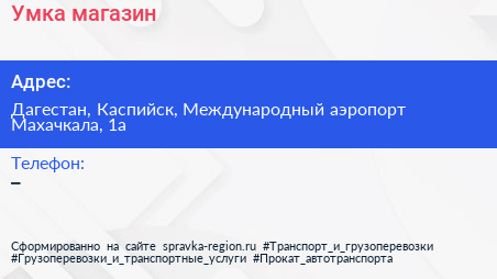 Умка, магазин по адресу Дагестан, Каспийск, Международный аэропорт Махачкала, 1а в дальнейшем Организация, размещена в следующих категориях: