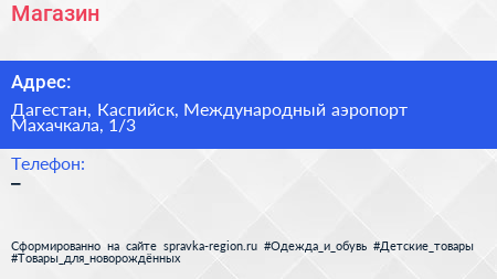 Магазин по адресу Дагестан, Каспийск, Международный аэропорт Махачкала, 1/3 в дальнейшем Организация, размещена в следующих категориях: