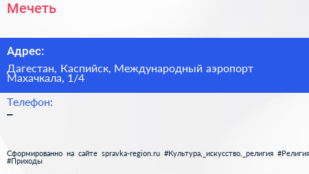Мечеть по адресу Дагестан, Каспийск, Международный аэропорт Махачкала, 1/4 в дальнейшем Организация, размещена в следующих категориях: