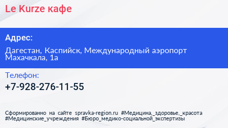 Le Kurze, кафе по адресу Дагестан, Каспийск, Международный аэропорт Махачкала, 1а в дальнейшем Организация, размещена в следующих категориях: