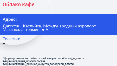 Облако, кафе по адресу Дагестан, Каспийск, Международный аэропорт Махачкала, терминал А в дальнейшем Организация, размещена в следующих категориях:
