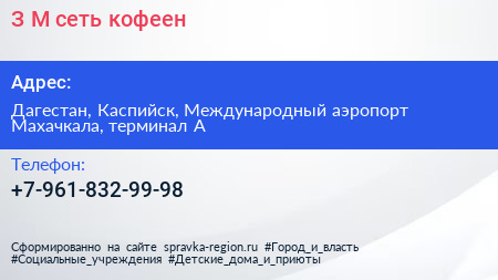 З & М, сеть кофеен по адресу Дагестан, Каспийск, Международный аэропорт Махачкала, терминал А в дальнейшем Организация, размещена в следующих категориях: