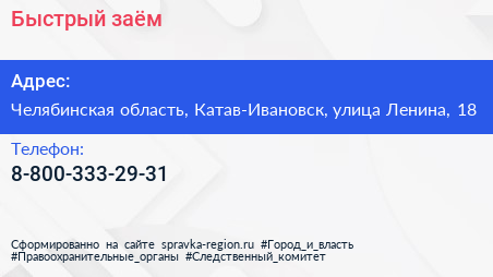 Быстрый заём по адресу Челябинская область, Катав-Ивановск, улица Ленина, 18 в дальнейшем Организация, размещена в следующих категориях: