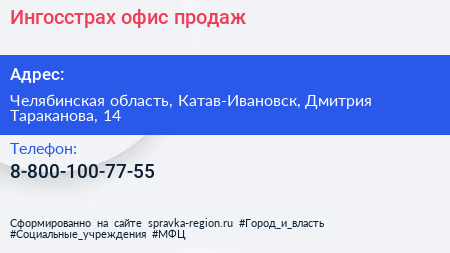Ингосстрах, офис продаж по адресу Челябинская область, Катав-Ивановск, Дмитрия Тараканова, 14 в дальнейшем Организация, размещена в следующих категориях:
