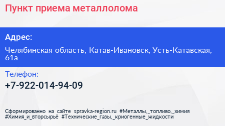 Пункт приема металлолома по адресу Челябинская область, Катав-Ивановск, Усть-Катавская, 61а в дальнейшем Организация, размещена в следующих категориях: