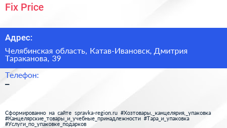 Fix Price по адресу Челябинская область, Катав-Ивановск, Дмитрия Тараканова, 39 в дальнейшем Организация, размещена в следующих категориях: