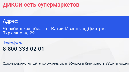 ДИКСИ, сеть супермаркетов по адресу Челябинская область, Катав-Ивановск, Дмитрия Тараканова, 29 в дальнейшем Организация, размещена в следующих категориях: