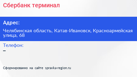Сбербанк, терминал по адресу Челябинская область, Катав-Ивановск, Красноармейская улица, 68 в дальнейшем Организация, размещена в следующих категориях: