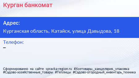 Курган, банкомат по адресу Курганская область, Катайск, улица Давыдова, 18 в дальнейшем Организация, размещена в следующих категориях: