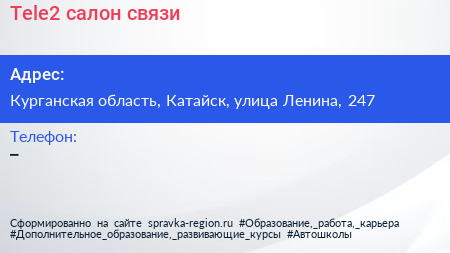 Tele2, салон связи по адресу Курганская область, Катайск, улица Ленина, 247 в дальнейшем Организация, размещена в следующих категориях: