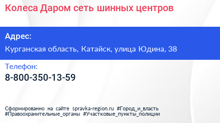 Колеса Даром, сеть шинных центров по адресу Курганская область, Катайск, улица Юдина, 38 в дальнейшем Организация, размещена в следующих категориях: