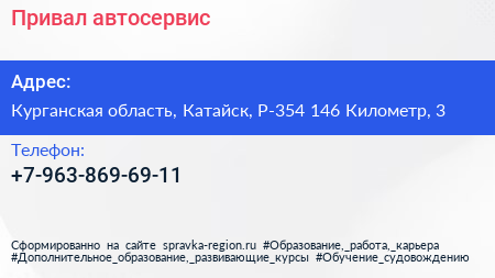 Привал, автосервис по адресу Курганская область, Катайск, Р-354 146 Километр, 3 в дальнейшем Организация, размещена в следующих категориях: