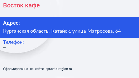 Восток, кафе по адресу Курганская область, Катайск, улица Матросова, 64 в дальнейшем Организация, размещена в следующих категориях: