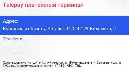 Telepay, платежный терминал по адресу Курганская область, Катайск, Р-354 129 Километр, 2 в дальнейшем Организация, размещена в следующих категориях: