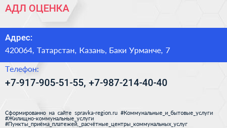 АДЛ ОЦЕНКА по адресу 420064, Татарстан, Казань, Баки Урманче, 7 в дальнейшем Организация, размещена в следующих категориях: