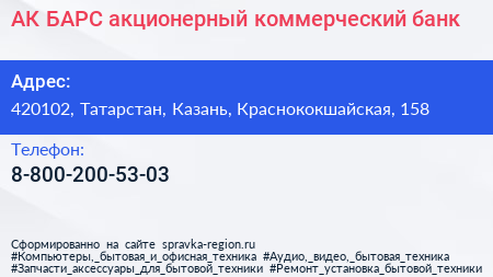 АК БАРС, акционерный коммерческий банк по адресу 420102, Татарстан, Казань, Краснококшайская, 158 в дальнейшем Организация, размещена в следующих категориях: