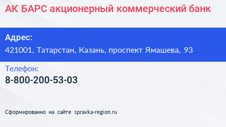 АК БАРС, акционерный коммерческий банк по адресу 421001, Татарстан, Казань, проспект Ямашева, 93 в дальнейшем Организация, размещена в следующих категориях: