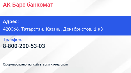 АК Барс, банкомат по адресу 420066, Татарстан, Казань, Декабристов, 1 к3 в дальнейшем Организация, размещена в следующих категориях: