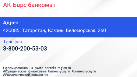 АК Барс, банкомат по адресу 420085, Татарстан, Казань, Беломорская, 260 в дальнейшем Организация, размещена в следующих категориях: