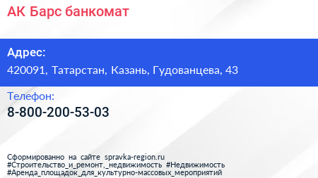 АК Барс, банкомат по адресу 420091, Татарстан, Казань, Гудованцева, 43 в дальнейшем Организация, размещена в следующих категориях: