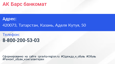 АК Барс, банкомат по адресу 420073, Татарстан, Казань, Аделя Кутуя, 50 в дальнейшем Организация, размещена в следующих категориях: