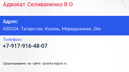 Адвокат Селиваненко В.О. по адресу 420124, Татарстан, Казань, Меридианная, 26а в дальнейшем Организация, размещена в следующих категориях: