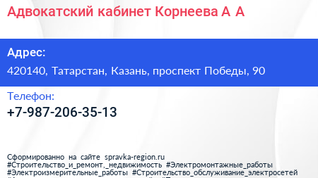 Адвокатский кабинет Корнеева А.А. по адресу 420140, Татарстан, Казань, проспект Победы, 90 в дальнейшем Организация, размещена в следующих категориях: