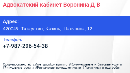 Адвокатский кабинет Воронина Д.В. по адресу 420049, Татарстан, Казань, Шаляпина, 12 в дальнейшем Организация, размещена в следующих категориях: