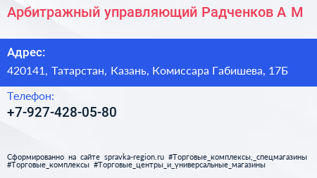 Арбитражный управляющий Радченков А.М. по адресу 420141, Татарстан, Казань, Комиссара Габишева, 17Б в дальнейшем Организация, размещена в следующих категориях: