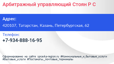 Арбитражный управляющий Стоян Р.С. по адресу 420107, Татарстан, Казань, Петербургская, 62 в дальнейшем Организация, размещена в следующих категориях: