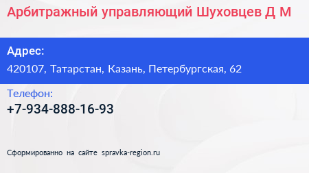 Арбитражный управляющий Шуховцев Д.М. по адресу 420107, Татарстан, Казань, Петербургская, 62 в дальнейшем Организация, размещена в следующих категориях: