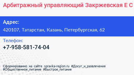 Арбитражный управляющий Закржевская Е.С. по адресу 420107, Татарстан, Казань, Петербургская, 62 в дальнейшем Организация, размещена в следующих категориях: