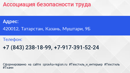 Ассоциация безопасности труда по адресу 420012, Татарстан, Казань, Муштари, 9Б в дальнейшем Организация, размещена в следующих категориях:
