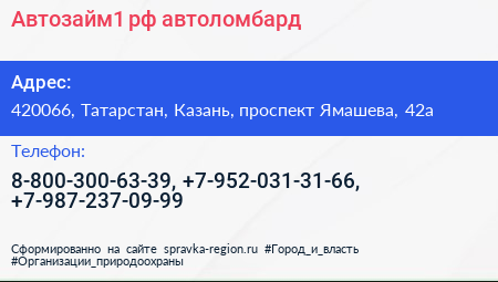 Автозайм1.рф, автоломбард по адресу 420066, Татарстан, Казань, проспект Ямашева, 42а в дальнейшем Организация, размещена в следующих категориях: