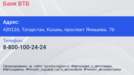 Банк ВТБ по адресу 420126, Татарстан, Казань, проспект Ямашева, 76 в дальнейшем Организация, размещена в следующих категориях: