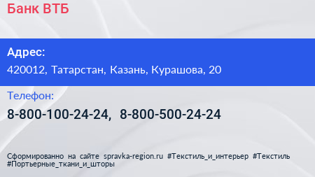 Банк ВТБ по адресу 420012, Татарстан, Казань, Курашова, 20 в дальнейшем Организация, размещена в следующих категориях: