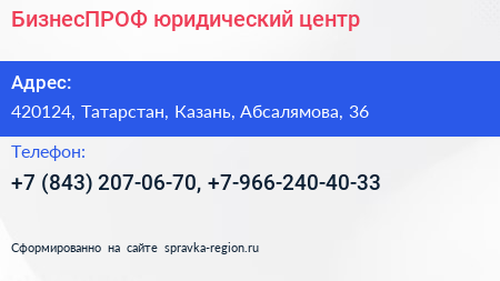 БизнесПРОФ, юридический центр по адресу 420124, Татарстан, Казань, Абсалямова, 36 в дальнейшем Организация, размещена в следующих категориях: