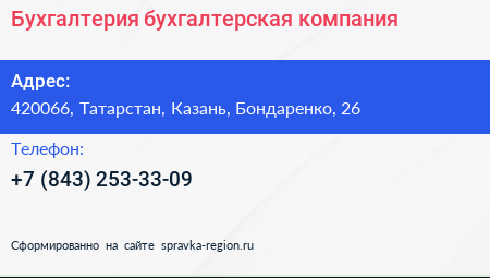 Бухгалтерия, бухгалтерская компания по адресу 420066, Татарстан, Казань, Бондаренко, 26 в дальнейшем Организация, размещена в следующих категориях: