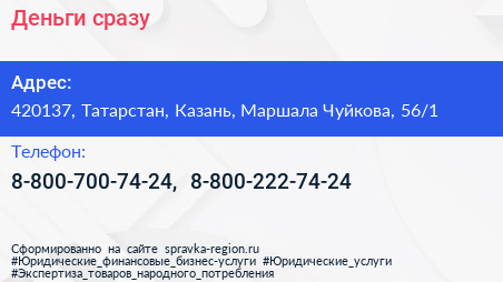 Деньги сразу по адресу 420137, Татарстан, Казань, Маршала Чуйкова, 56/1 в дальнейшем Организация, размещена в следующих категориях: