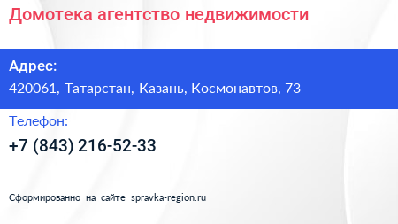 Домотека, агентство недвижимости по адресу 420061, Татарстан, Казань, Космонавтов, 73 в дальнейшем Организация, размещена в следующих категориях: