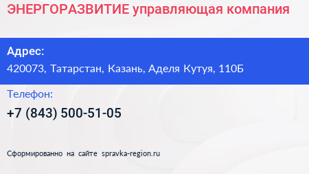 ЭНЕРГОРАЗВИТИЕ, управляющая компания по адресу 420073, Татарстан, Казань, Аделя Кутуя, 110Б в дальнейшем Организация, размещена в следующих категориях: