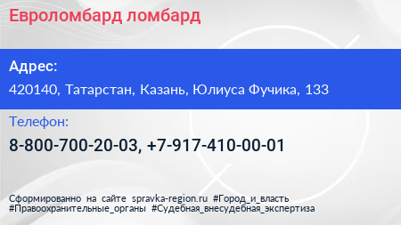 Евроломбард, ломбард по адресу 420140, Татарстан, Казань, Юлиуса Фучика, 133 в дальнейшем Организация, размещена в следующих категориях: