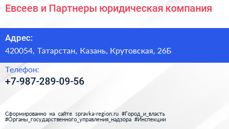 Евсеев и Партнеры, юридическая компания по адресу 420054, Татарстан, Казань, Крутовская, 26Б в дальнейшем Организация, размещена в следующих категориях: