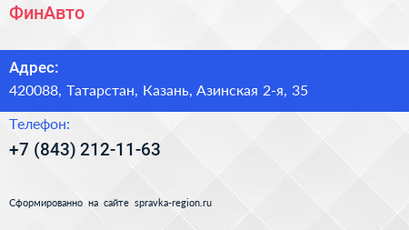ФинАвто по адресу 420088, Татарстан, Казань, Азинская 2-я, 35 в дальнейшем Организация, размещена в следующих категориях:
